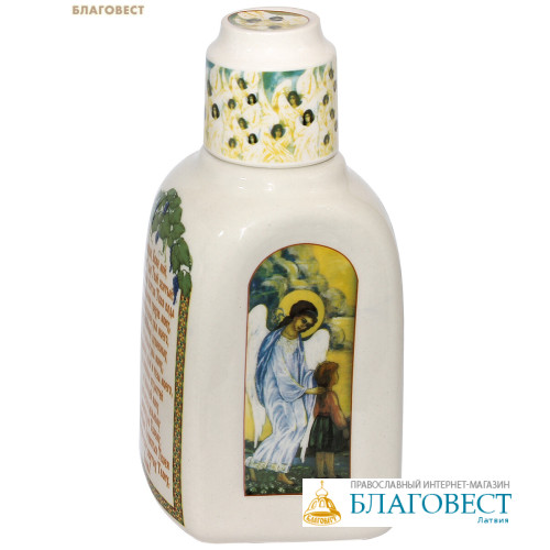 Сосуд для святой воды изготовлен из фарфора и покрыт глазурью. Объем 0,8 литра. На стенках изделия расположены иконы и молитвы, нанесенные с использованием деколей. Крышка может использоваться, как стаканчик.Фарфор - благороднейший и наиболее совершенный вид керамики. Фарфоровую смесь тщательно вымешивают, процеживают и отливают в специальные формы. Отформованные предметы трижды обжигают: сначала до температуры 700-800 градусов, затем покрывают глазурью и обжигают до 1200-1350 градусов, после изделия расписывают и снова отправляют в печь, чтобы роспись была яркой и стойкой.Недаром фарфор величают «белым золотом». Его издревле изготавливают по всему миру. Само слово «фарфор» созвучно со словом Фавор. «Гора Фавор, земное небо, отрада души и услаждение глаз православных людей. Ибо этой горе присуща преосеняющая ее некая божественная благодать, оттого она и возбуждает духовную радость» - сказал свт. Григорий Палама. Так и изделия из фарфора изготавливаются не только для пользы, но для души, чтобы радовать глаз и греть душу.