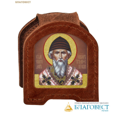 Икона дорожная раскладная Святитель Спиридон Тримифунтский (натуральная кожа). Цвет коньяк
