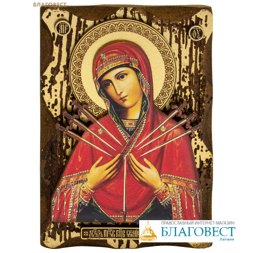 Икона под старину Пресвятая Богородица «Семистрельная», дерево, размер 9,5х13,5см