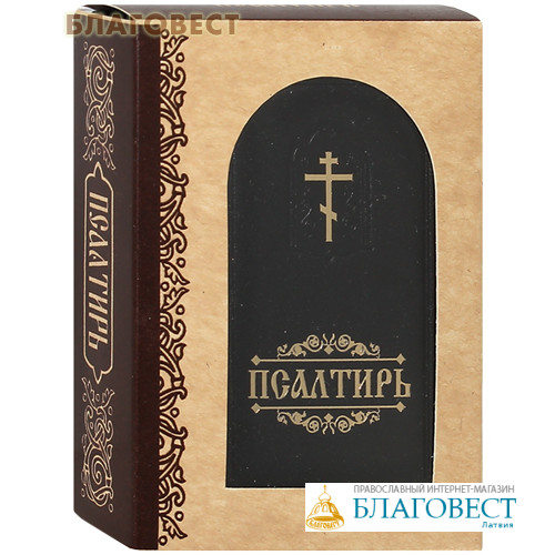 Псалтирь на русском языке малого формата в кожаном переплете ручной работы с блинтовым тиснением и с тиснением золотой фольгой. Текст отпечатан традиционным шрифтом в две краски на качественной офсетной бумаге. Издание снабжено ленточкой-закладкой и помещено в подарочный картонный короб.