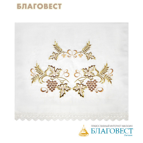Вышивка создана золотой нитью. Рисунок на рушнике выполнен симметрично на противоположных сторонах изделия, концы которых украшены кружевом. Материал 100% лен. Размер рушника 45*155см.Для того, чтобы стать мужем и женой перед Господом, необходимо пройти обряд венчания. Чтобы осуществить этот обряд необходимо найти хотя бы двух свидетелей и приготовить всё необходимое, в том числе и рушники. Рушник может быть символом облака, на которое молодожёны должны встать, чтобы перед лицом Господа в Царствии небесном стать мужем и женой, а может выполнять функцию «союзного» рушника. Таким рушником священник перевязывает руки молодых, как бы скрепляя их союз и знаменуя духовное родство и союз взаимной любви. Молодые, руки которых будут перевязаны рушником, становятся единым целым - семьёй.Такая вещь, как рушник для проведения церемонии венчания, хранится в семье, как реликвия. Передавая его из поколения в поколение, передаются традиции семейные и церковные. Передавая рушник своим детям, мы прививаем основы духовного воспитания. Вот почему его значение так ценно.