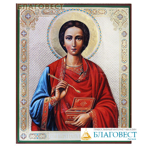 Перед Вами один из самых распространённых и почитаемых образов в Православной церкви - икона целителя Пантелеймона, небесного покровителя врачей и воинов. На иконе изображён прекрасный светлый юноша, в руках его принадлежности, выдающие в нём целителя: коробочка для лекарств и мерная ложка. Жизнь юного врача оказалась очень короткой, но память о делах его и вере его будет жить всегда, служа напоминанием о том великом подвиге духа и тела, который совершили во имя Христа все великомученики. При Таинстве соборования, во время помазания елеем тела больного, собор из семи священников обращается с молитвою именно к Святому Пантелеймону, дабы дал он Божию благодать для исцеления страждущего. Образ Пантелеймона Целителя всегда есть в церкви - при освящении воды именно к этому Святому обращаются с молитвою священнослужители. Иконе Святого Пантелеймона молятся при разных болезнях и недугах - как душевных, так и физических, кроме того образом великомученика вдохновляются и укрепляются представители военных профессий.