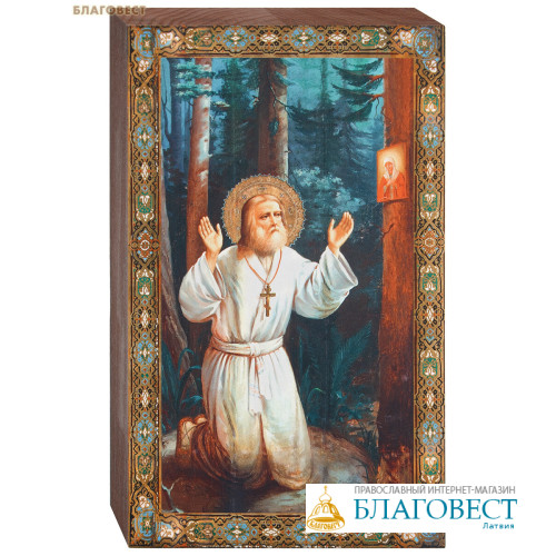 Начало XX века. Находится в церкви Покрова Пресвятой Богородицы в Черкизово (Московская область, Пушкинский район).Преподобный Серафим (в миру Прохор) родился в 1754 году в Курске. В 24 года он ушел в Саровский монастырь, а затем удалился в лес, где вел отшельническую жизнь почти 40 лет. На образе святой изображен молящимся на камне пред иконою Божией Матери «Умиление». Этот подвиг он совершал 1000 дней и ночей подряд. В 1825 году святому явилась Божья Матерь и повелела ему выйти из затвора и принимать людей, нуждающихся в помощи. «Христос Воскресе, радость моя» – этими словами святой встречал каждого приходящего к нему человека, в независимости от его возраста и социального положения. Святой Серафим предсказал кровавые события после 1917 года, гонение на веру и последующее возрождение России. 2-го января святой преставился во время молитвы, стоя на коленях пред образом своей любимой иконы Божьей Матери «Умиление».Материалы: дерево, пигментные краски, матовый лак. Икона соответствует православным канонам и освящена.