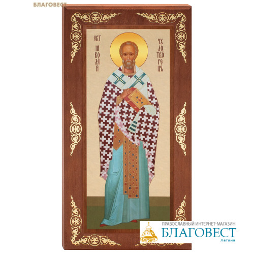 Икона ростовая Святитель Николай Чудотворец. Печатное (полиграфическое) изображение накатано на деревянную основу (дерево ценных пород – ольха, береза). Образ покрыт защитным лаковым слоем. На обратной стороне иконы имеется отверстие для крепления на стену.